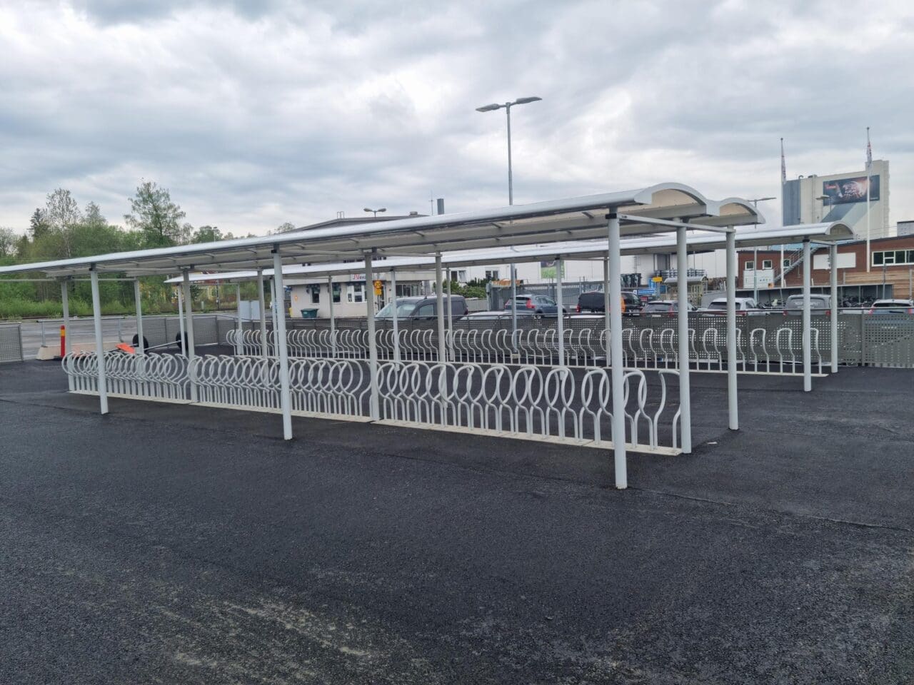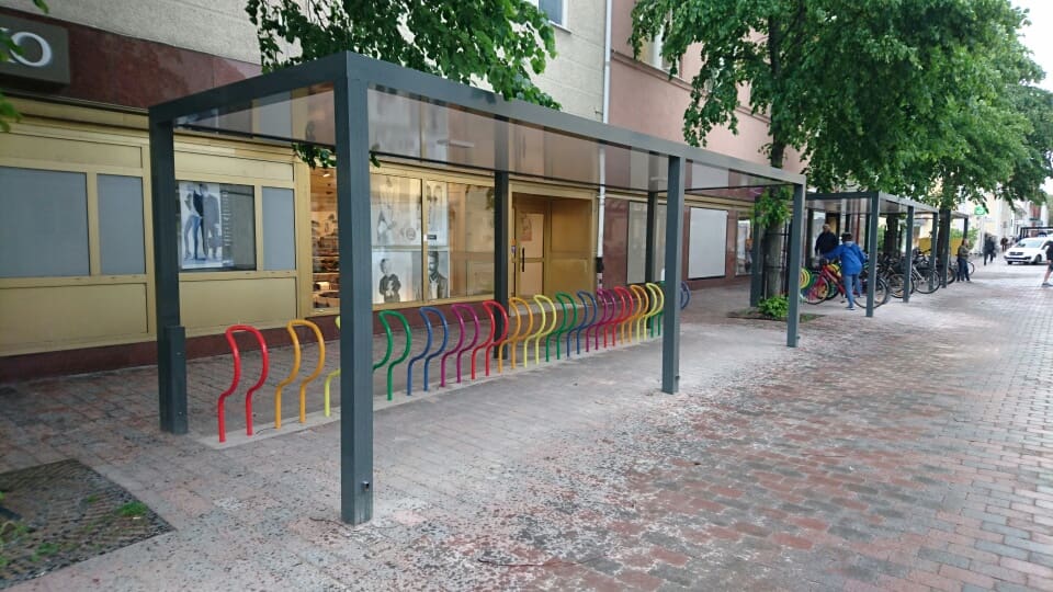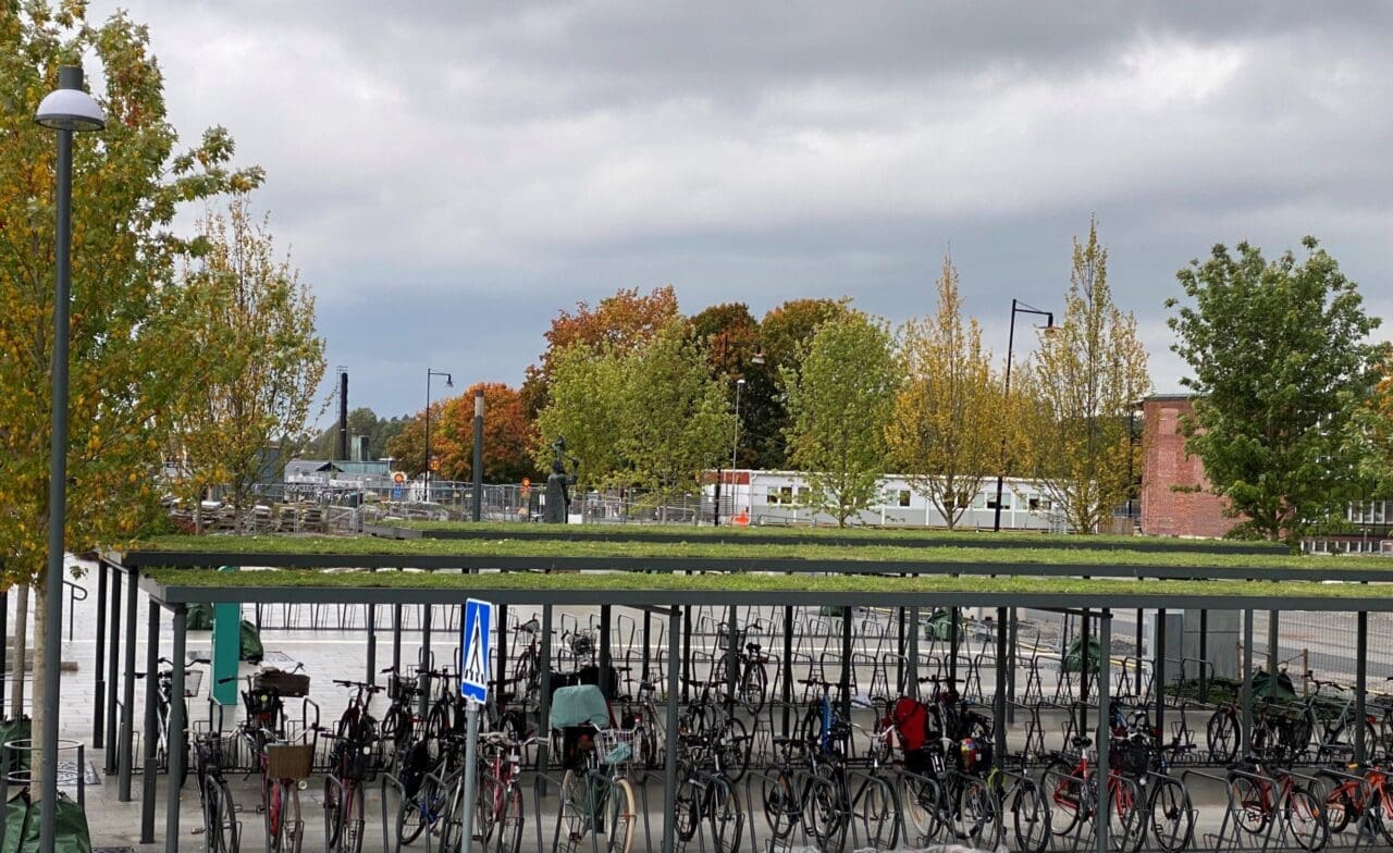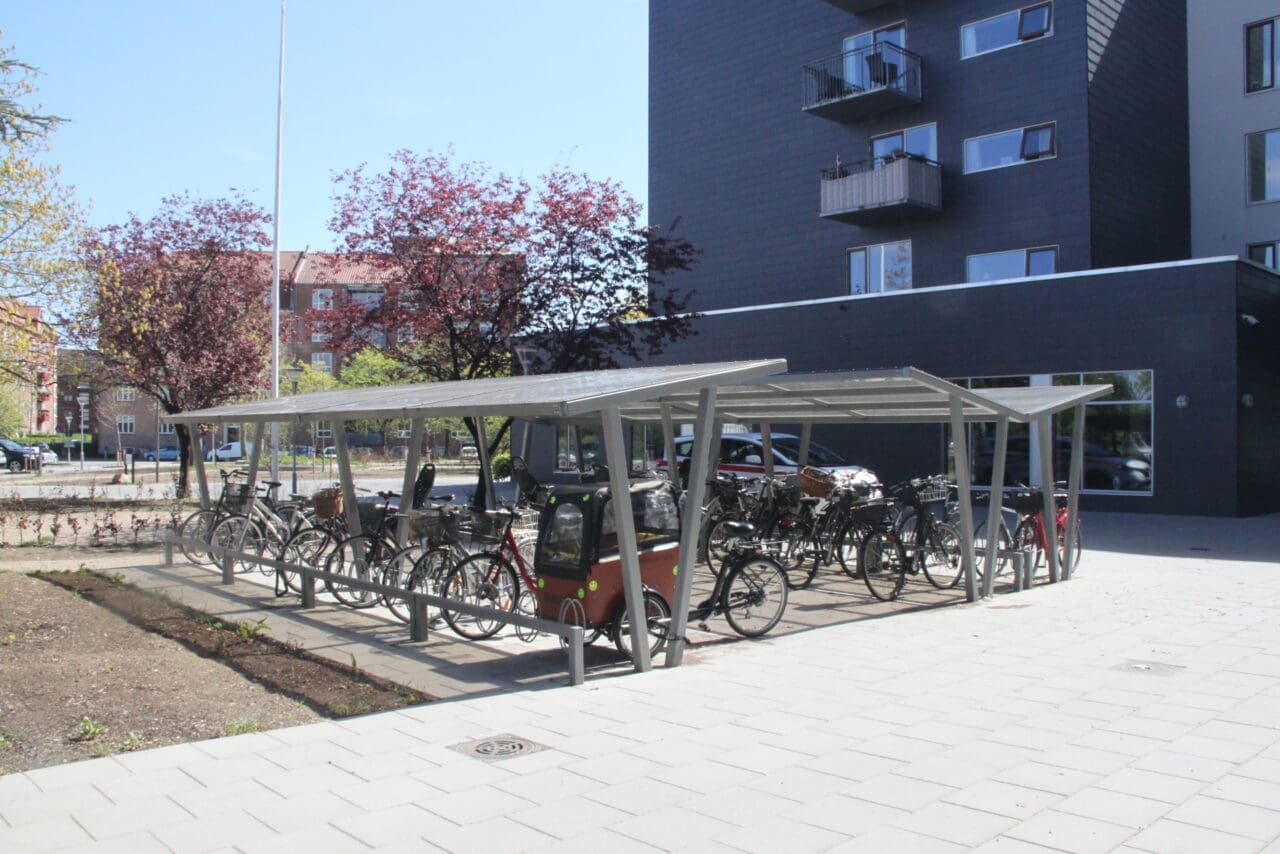 Cykeltak SHARP Plaza med Arc cykelställ, Nyköping